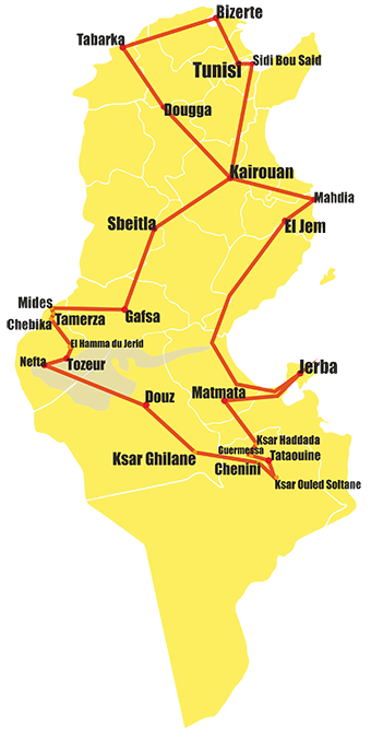 Sarà un tipico viaggio overland, effettuato in moto da enduro (mezzo ideale per il vostro territorio), che percorrerà da Nord a Sud tutte le località che meglio rappresentano il paesaggio, la storia e la cultura tunisine.